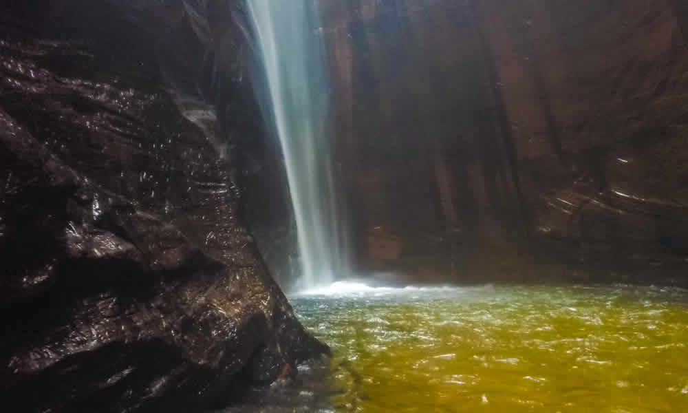 Chegar até a cachoeira é parte fundamental do encanto. O visitante percorre uma trilha de cerca de 400 metros dentro de um cânion estreito, onde as paredes rochosas parecem se fechar ao redor. O som da água aumenta gradualmente, preparando o viajante para o grande espetáculo que se revela ao final do caminho. Dessa forma, a caminhada não é apenas um deslocamento, mas uma imersão na grandiosidade natural da Chapada.
